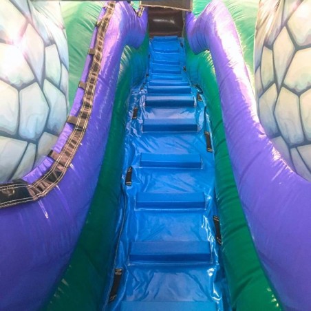 Diese aufblasbare Wasserrutsche bleibt nicht unbemerkt. Ihre Farben und Formen erinnern an eine wilde und geheimnisvolle Welt. Die Außenfassaden der Struktur sehen aus wie große Holzstämme mit Steinen. Die Bahn, auf der man nach unten rutscht, ist blau wie ein reißender Fluss! Um das Wasserspiel noch realistischer zu gestalten, ist auf der Rutsche ein kleines Schild mit der Aufschrift „WILD RAPIDS“ angebracht. Dieses gemischte Thema wird Kinder und Eltern gleichermaßen ansprechen.