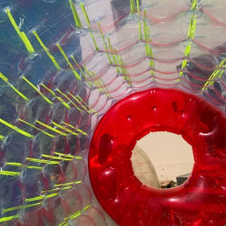 Diese aufblasbare Blase ist sehr stabil. Sie wird aus TPU hergestellt, einem thermoplastischen Kunststoff, der verschleiß- und abriebfest ist. Der Zorb Ball kann daher nicht reißen. Im Inneren der Blase wird der Spieler mit Geschirren gesichert, die die Sicherheit erhöhen. Zwei seitliche Öffnungen sind ebenfalls in der aufblasbaren Struktur zu sehen. So kann der Spieler leicht aus der aufblasbaren Blase aussteigen.