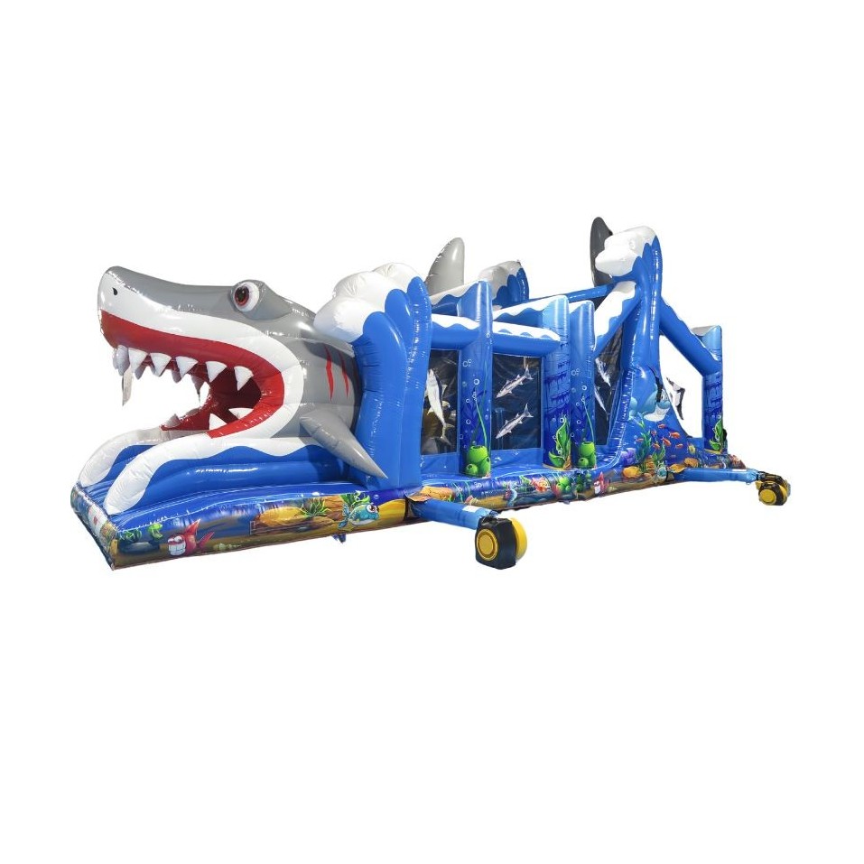 Der Hüpfburghindernisparcours Hai ist eine grandiose Konstruktion, die Kinder in ein immersives Wasserabenteuer eintauchen lässt. Sein spektakuläres Design, das einen riesigen Hai in den Vordergrund stellt, der bereit ist, die Abenteurer zu verschlingen, garantiert einen sofortigen Wow-Effekt. Dieser Hüpfburghindernisparcours wurde entwickelt, um ein dynamisches und anregendes Erlebnis zu bieten, und kombiniert Hindernisse, Rutschen und Herausforderungen aller Art, um den Kindern größtes Vergnügen zu bereiten