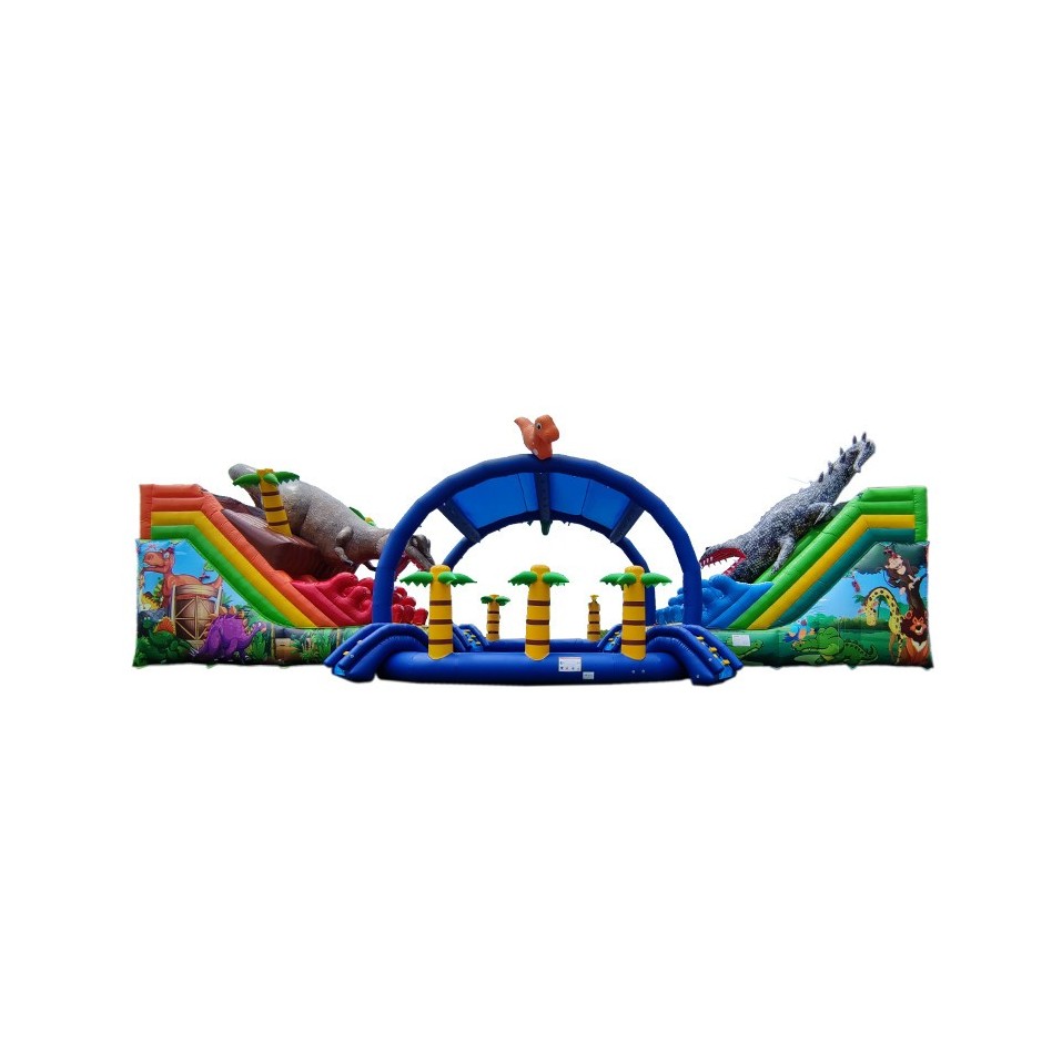 Play your part in the great battle between the giant T-Rex and the incredible Crocodile! The Croco Vs Dino Water Park is the perfect attraction to cool off in the summer seasons. Kids will love its realistic design featuring a giant inflated T-Rex and Crocodile! The playground of this inflatable water park second hand features a multi-activity play area with climbing zones and inflatable water slides. Children will have fun spraying themselves with water. This second hand inflatable water game can be seen from a distance. Dimensions: W20 x D10 x H7m. Maximum capacity: continuous flow. Minimum age: 3 years. 1 socket 220 V 16A. This second hand inflatable has been carefully examined by our teams.