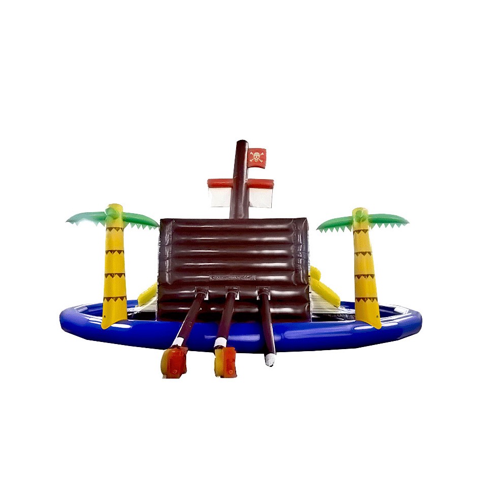 Kids can go boarding through the climbing areas! Inside the boat, they have a great view of the whole waterpark. Thanks to the two inflatable slides on either side of the boat, they can easily get out and land in the small pool. The wave illustrations and the small inflatable cannon make the water game even more real!