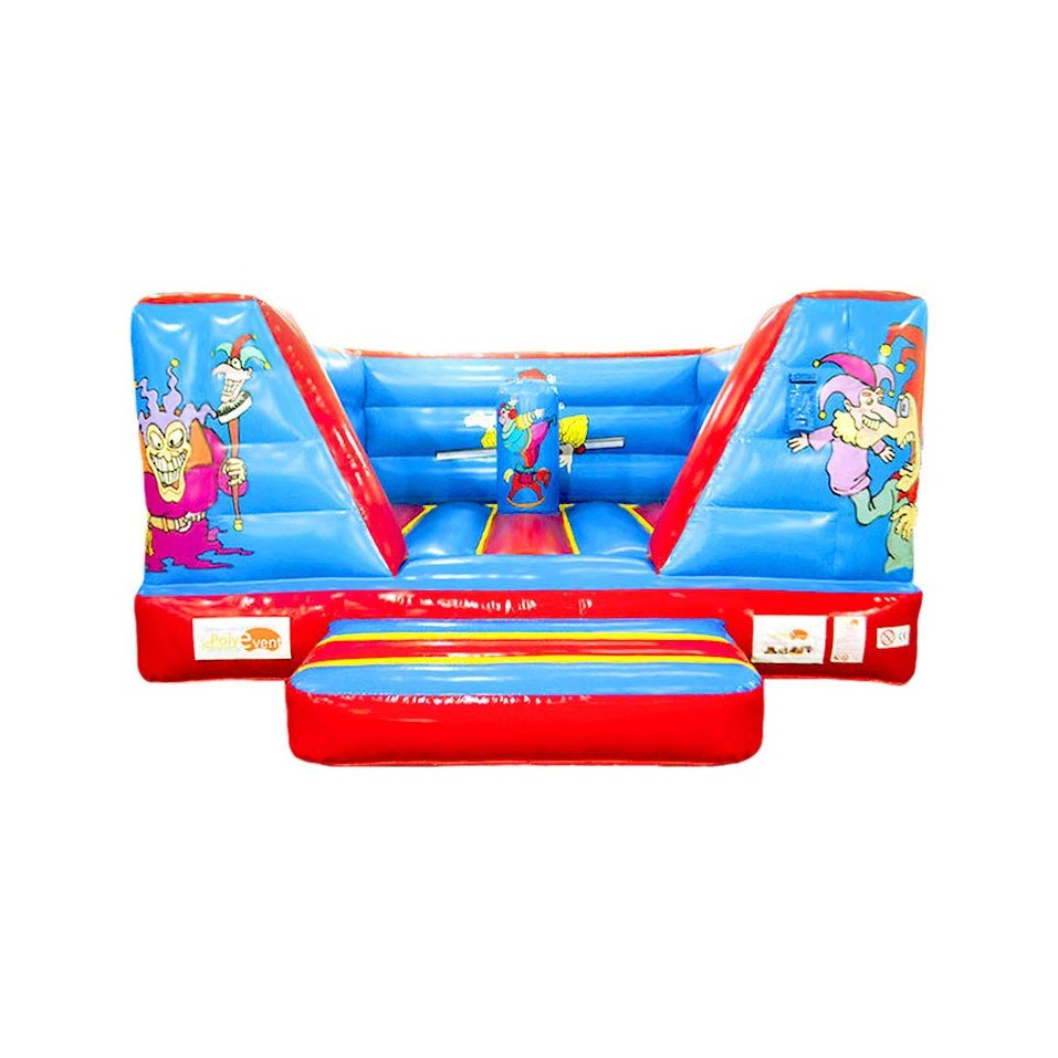 Este pequeño castillo hinchable hará las delicias de los niños y pondrá estrellas en sus ojos. Con su base de trampolín hinchable, su tótem interior colorido y sus paredes hinchables, los niños podrán divertirse saltando y rebotando por todas sus paredes con total seguridad. Nos gustan: las múltiples ilustraciones que lo visten y sus numerosos payasos invitando a la fiesta. Un castillo hinchable para niños, que les llevará a un mundo mágico y divertido, acogidos por divertidos payasos. Dimensiones: Pr 3 x An 4 x Al 2 m. Capacidad máxima: 8 personas. Edad mínima: 1 año. 1 toma de 220V 16A.