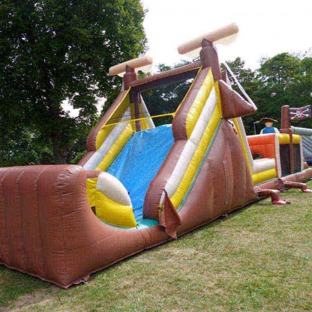 A true inflatable pirate ship with multiple pitfalls, this attraction will test our buccaneering games whose sole objective will be to cross the entire ship as quickly as possible. Bouncing, jumping, sliding, dodging, falling safely: children will compete fiercely to get to the end of the course first. Dimensions: W 3.5 x D 16 x H 5 m. Maximum capacity: 25 people in continuous flow. Minimum age: 3 years. 1 x 220V 16A socket.