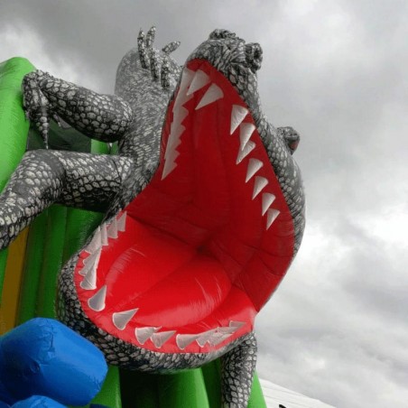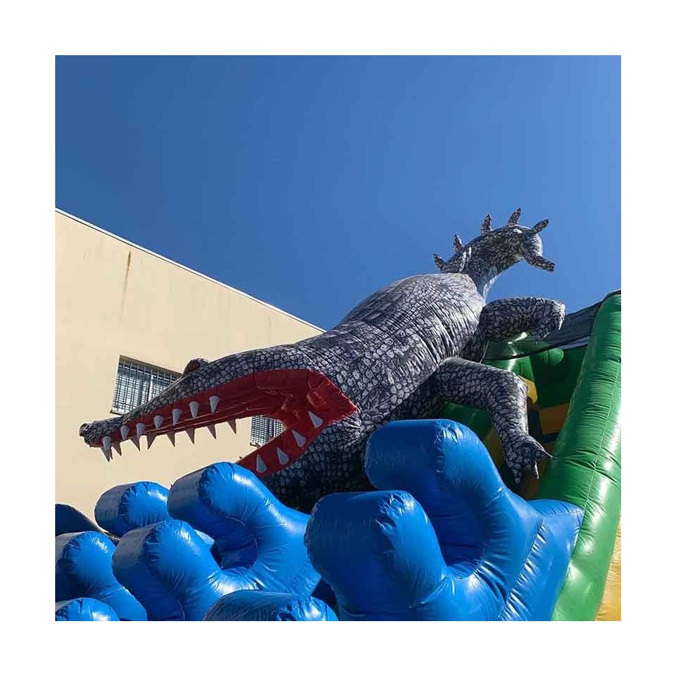 Si cerca un'attrazione visibile da lontano che catturi l'attenzione dei visitatori? Eccola: con il suo scivolo di 7 metri e l'enorme coccodrillo gonfiabile, questo imponente scivolo sorprenderà i giocatori, sia bambini che adulti. Con la sua bocca gigantesca e i canini affilati, il coccodrillo sarà al centro dell'attenzione e molti visitatori vorranno vederlo da vicino. I dettagli del coccodrillo gonfiabile sono molto realistici: la pelle di coccodrillo finemente illustrata, il colore verde palude, la coda appiattita, l'occhio stretto, le narici ravvicinate e il muso lungo, questo è un coccodrillo vero e proprio che prenderà posto tra le vostre attrazioni. Questo coccodrillo gonfiabile ha tutte le caratteristiche di un coccodrillo vero e stupirà i bambini con la sua incredibile presenza. Ci piace: la sua grandiosità per un effetto WOW garantito! I nostri piccoli esploratori non potranno fare a meno di arrampicarsi su una delle due pareti di arrampicata per avvicinarsi il più possibile alla bestia e poi scivolare giù da uno dei due scivoli gonfiabili.