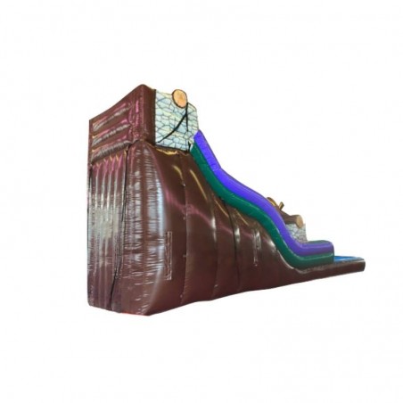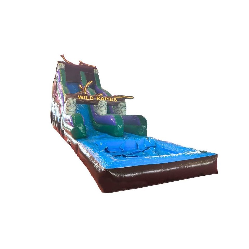 Questo scivolo gonfiabile acquatico non passa inosservato. I suoi colori e la sua forma ricordano un mondo selvaggio e misterioso. Le facciate esterne della struttura sembrano grandi tronchi di legno con pietre. Il percorso per scendere è colorato di blu come un fiume in piena! Per rendere il gioco acquatico ancora più realistico, sullo scivolo è apposto un piccolo cartello con la scritta “WILD RAPIDS”. Questo tema misto piacerà sia ai bambini che ai genitori.